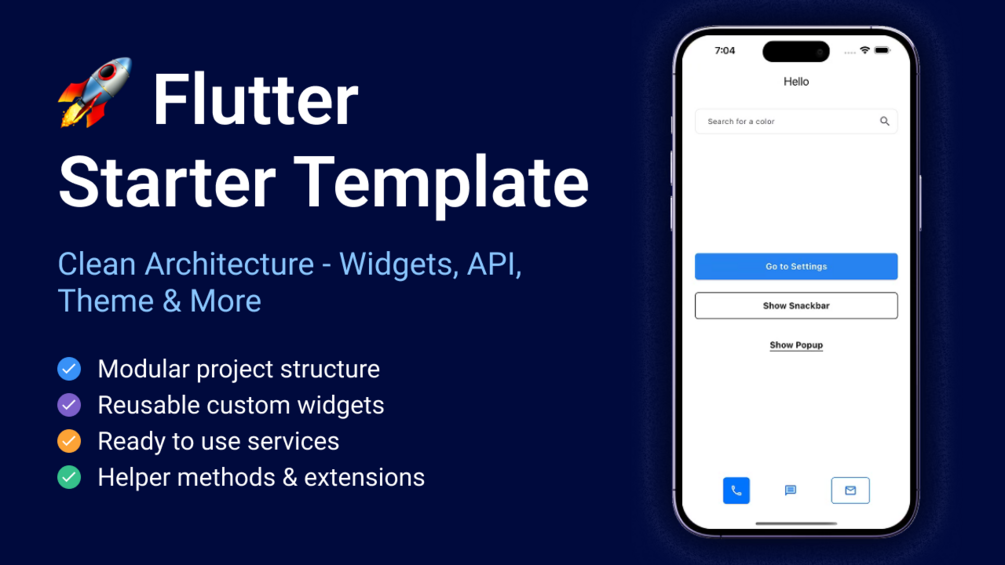 Donβt waste hours rewriting boilerplate! This production-ready Flutter Starter Template gets you up and running in minutes with clean architecture, useful widgets, theme management, networking, logging, shared preferences built in, and many other tools.